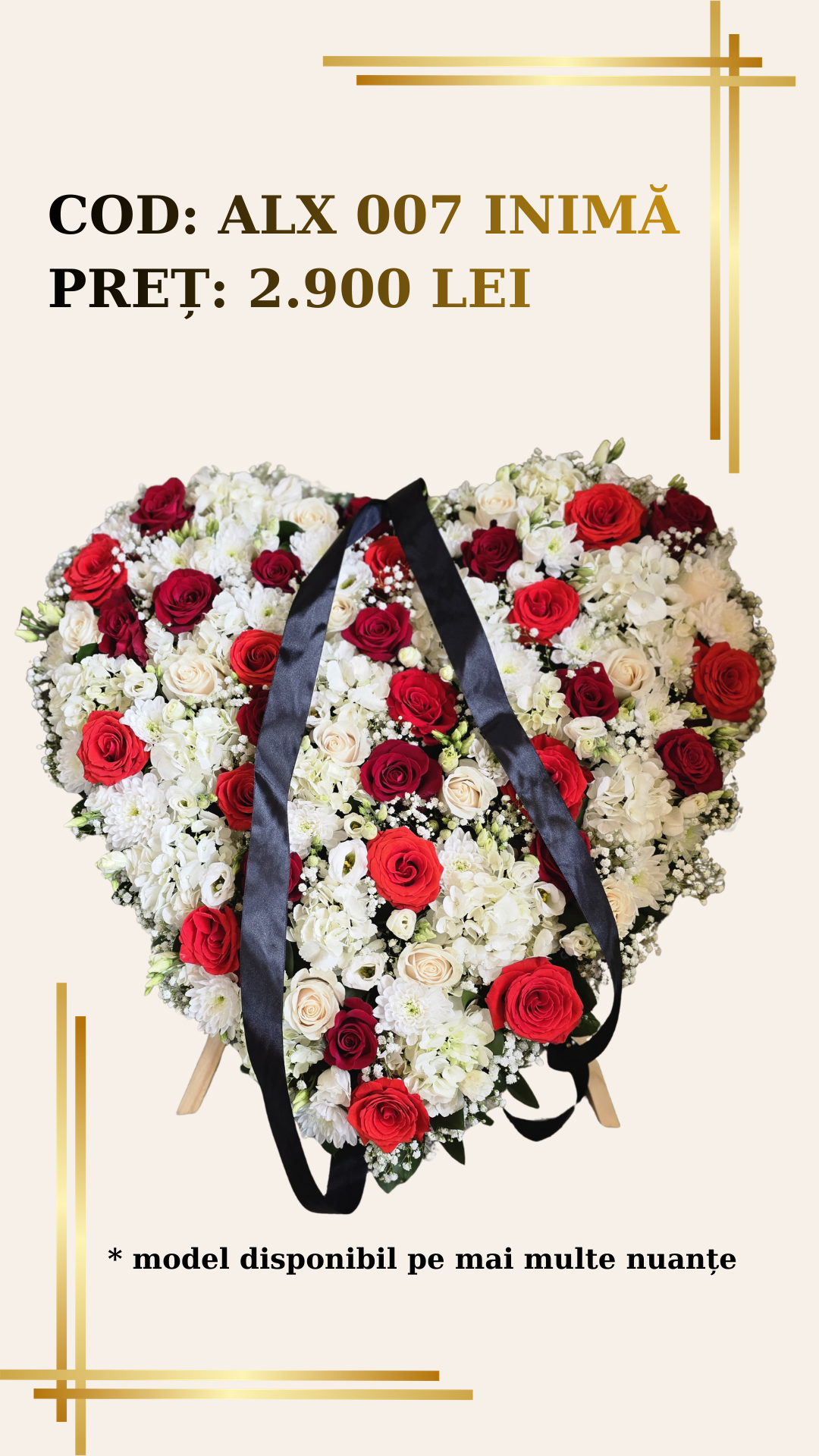 Coroana Funerara ALX 007 – Aranjament Mixt este un omagiu floral delicat, conceput pentru a onora memoria celor dragi. Această coroană funerară are forma unei inimi și este realizată dintr-o combinație atent aleasă de flori, inclusiv crizanteme albe, trandafiri roșii și alte flori albe, toate fiind proaspete și naturale. Fiecare detaliu este gândit pentru a transmite un mesaj profund de respect și compasiune.