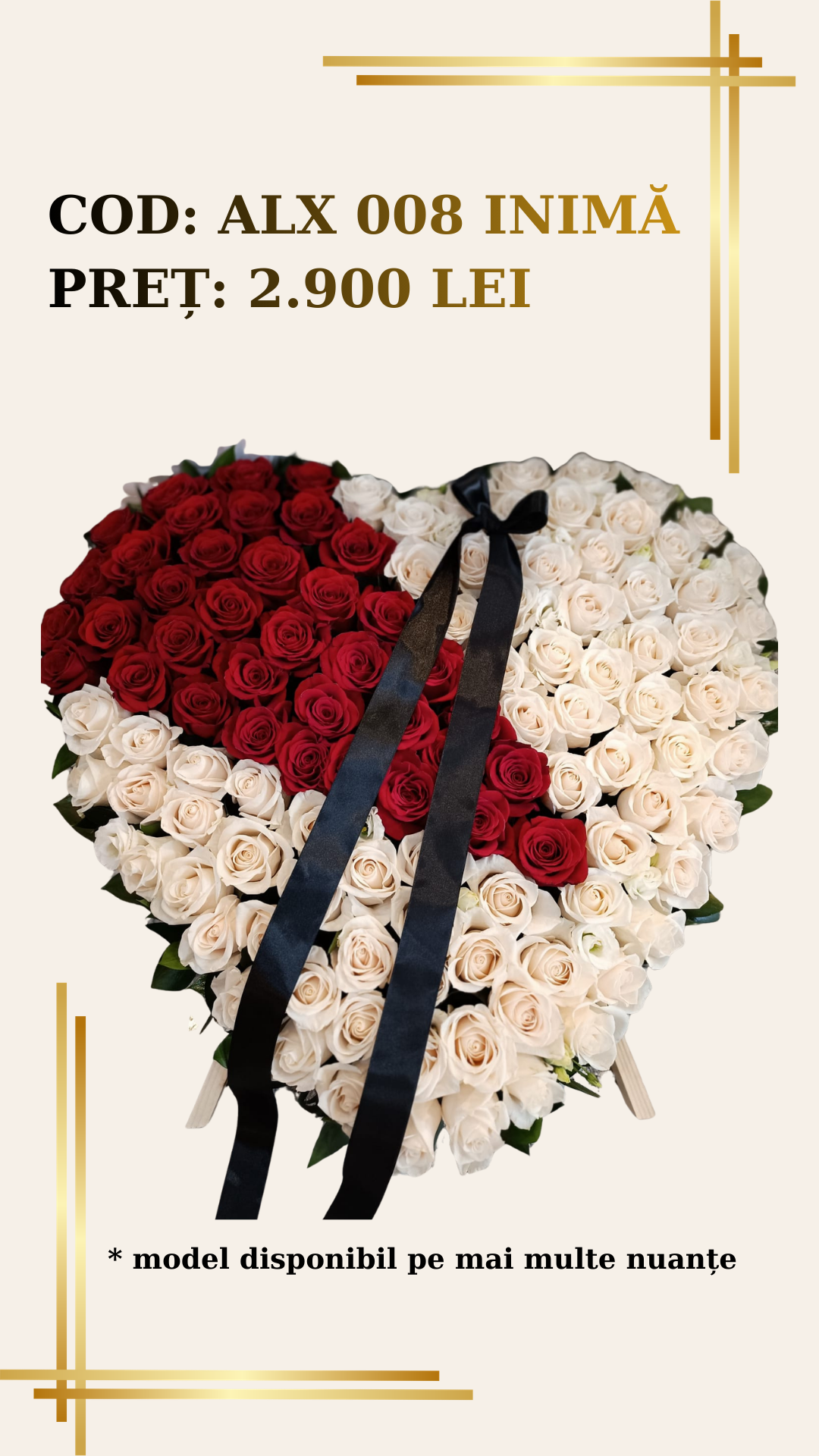 Coroana Funerara ALX 008 – Bicolor Trandafiri Rosii si Albi este un simbol al respectului și al dragostei pentru cei plecați dintre noi. Acest aranjament funerar în formă de inimă combină frumusețea trandafirilor roșii și albi/crem, fiind realizat cu flori naturale proaspete ce aduc un omagiu sincer și elegant.