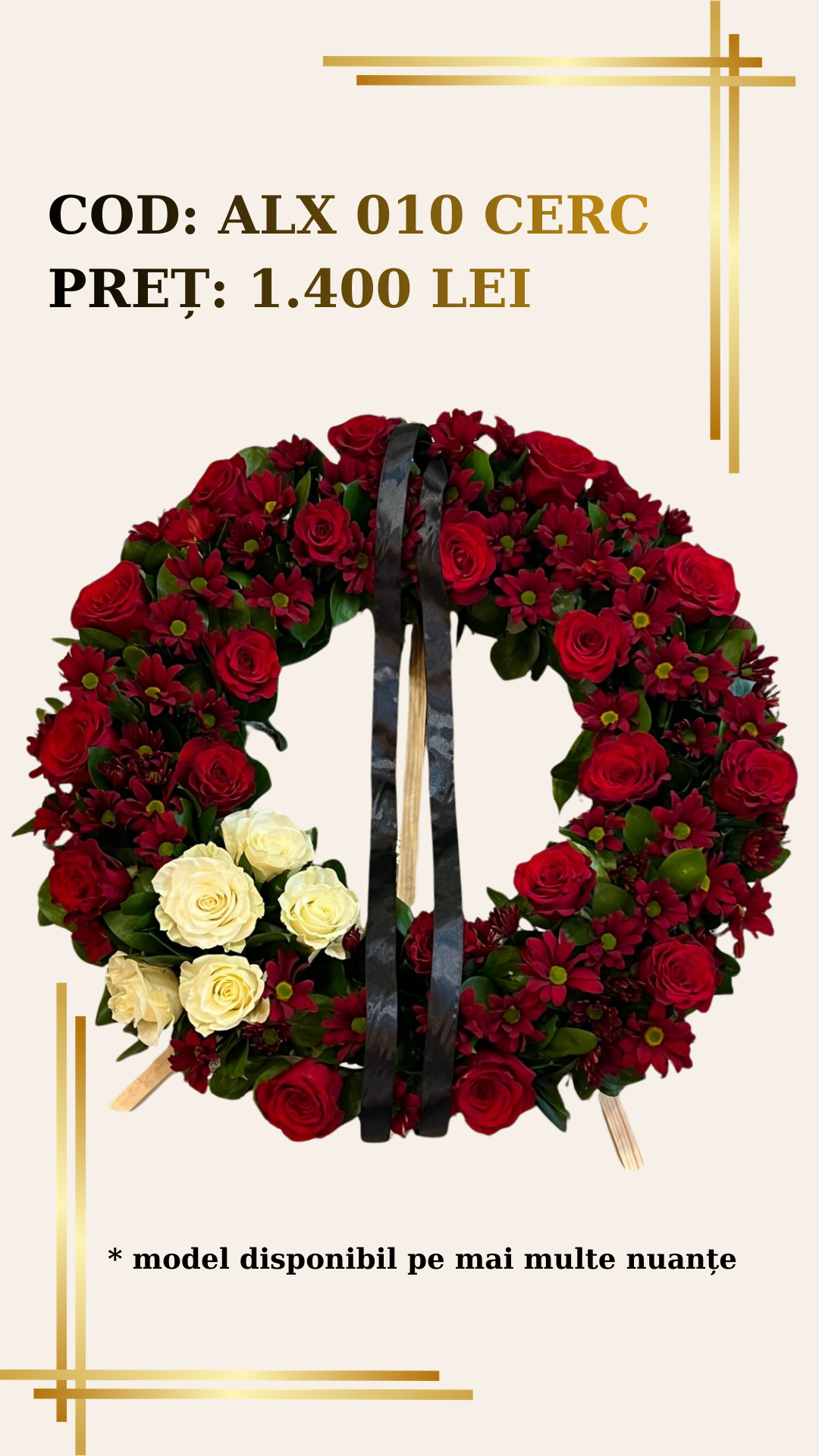 Coroana Funerara ALX 010 – Cerc Trandafiri Rosii cu Crizanteme si Accent Alb este un omagiu floral elegant dedicat celor plecați dintre noi.