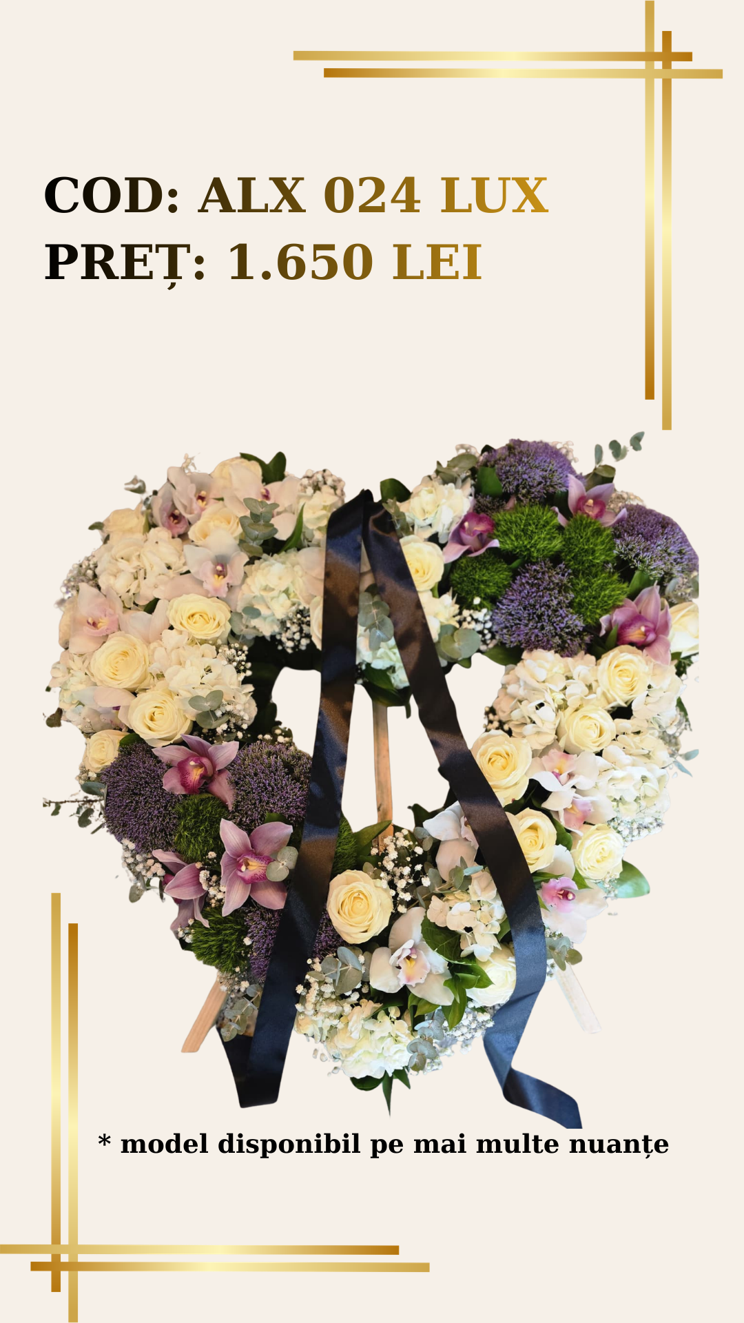 Aranjamentele florale, precum Inima Funerara ALX 024 – Lux Trandafiri Albi cu Orhidee Mov, sunt realizate cu empatie și profesionalism, având ca scop aducerea unui omagiu demn celor care ne-au părăsit. Livrarea se face la locația dorită, în București și Ilfov, asigurându-ne că suntem alături de dumneavoastră în fiecare pas al acestei perioade sensibile.