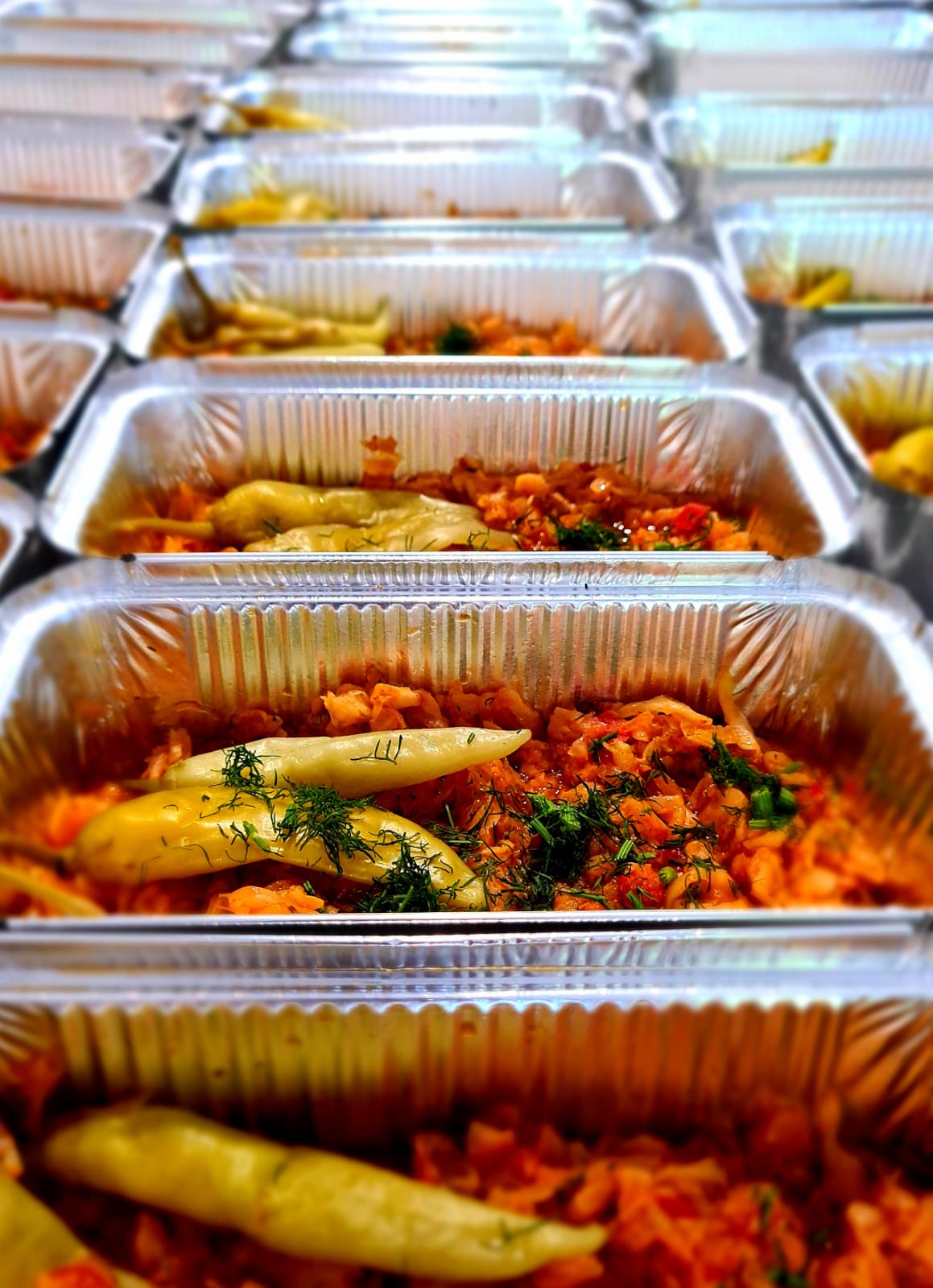 - Pachete alimentare: 12 pachete individuale care conțin farfurie, pahar, lingură inox, sarmale de post cu mămăligă și ardei iute verde, măr, o pungă mare cu covrigi, halva, salam de biscuiți, apă, suc, japoneză, caserolă cu colivă, lumânare pastilă și pungă neagră de hârtie.