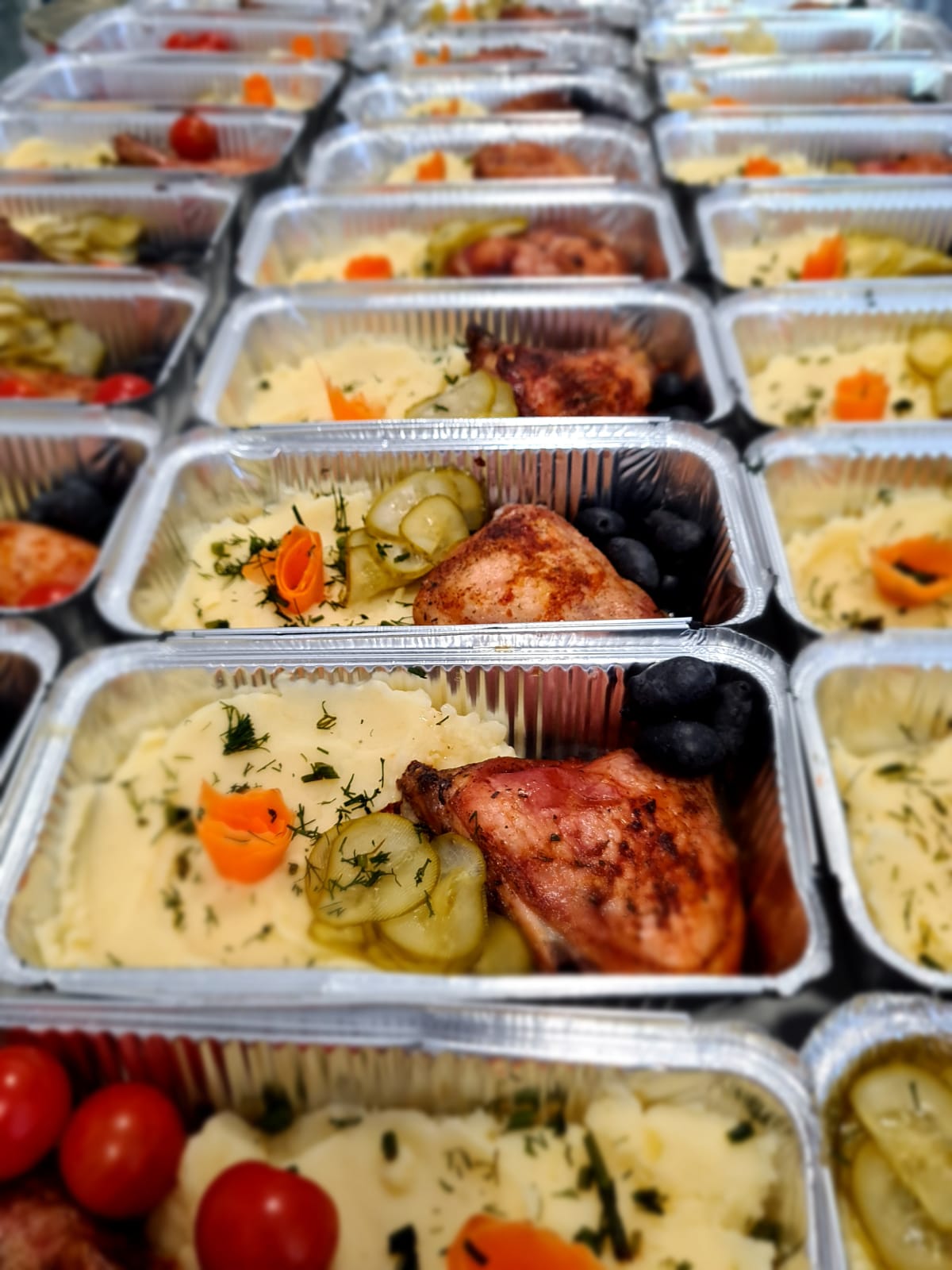 - Pachete alimentare: 12 pachete individuale care includ: farfurie, pahar, lingură din inox, pulpa de pui la cuptor cu orez și legume, salată de varză murată, măr, punga mare cu covrigi, croissant, apă, suc, japoneză, caserolă cu colivă, lumânare pastilă, punga neagră de hârtie.