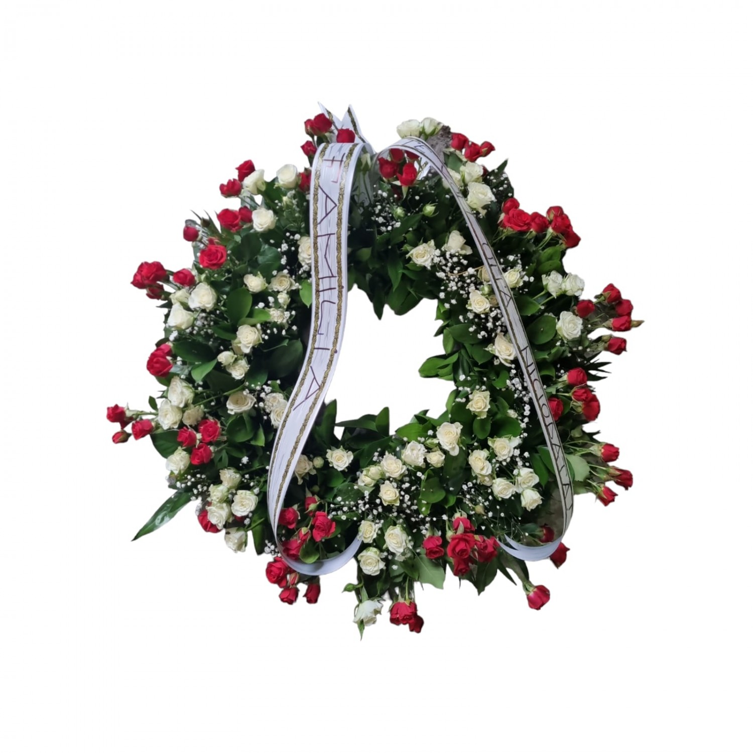 Coroana funerara compusa dintr-un mix de flori naturale.